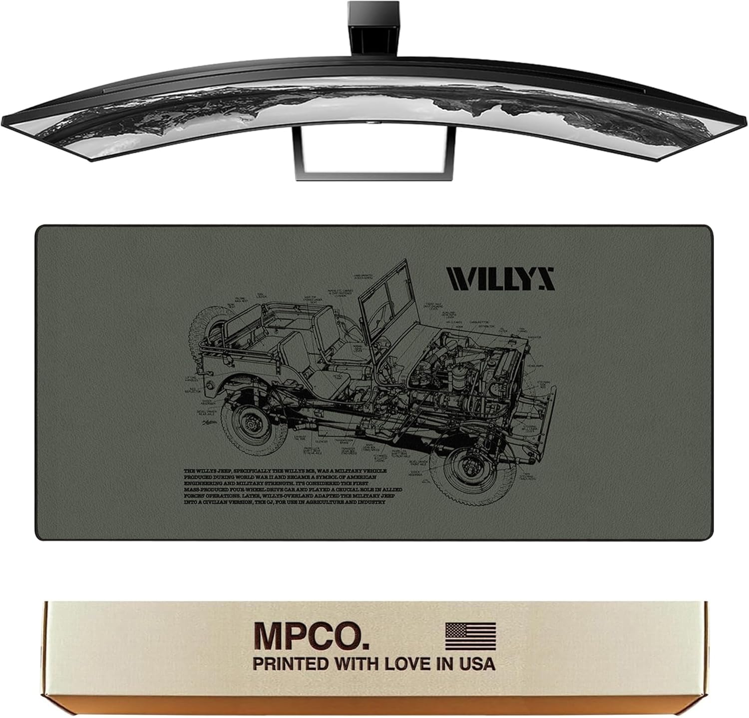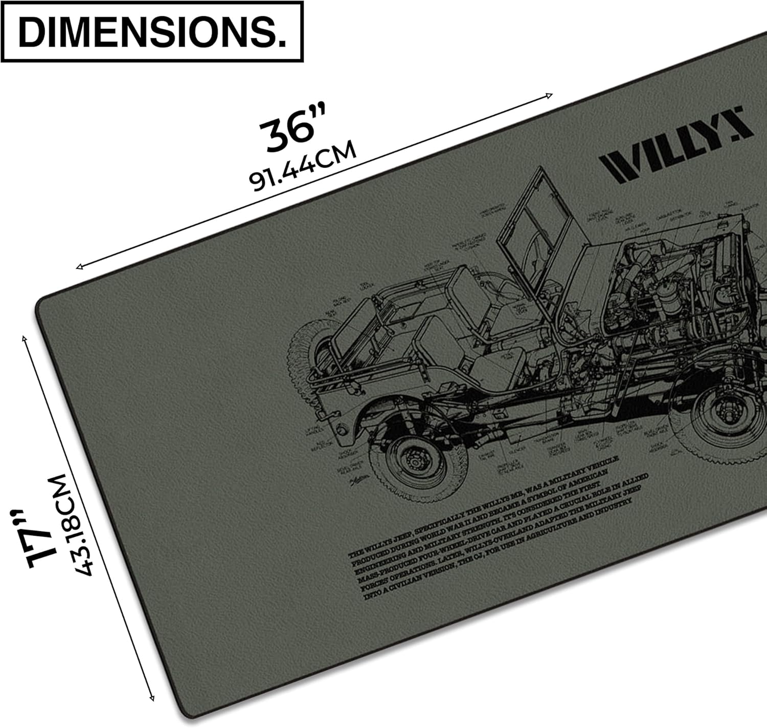 MPCO. Blueprints Large Gaming Desk Pad - 36" x 17" Duraglyde Fabric Willys Jeep – Green Desk Mats - Non-Slip, Washable, Smooth Glide for Precision Gaming & Work