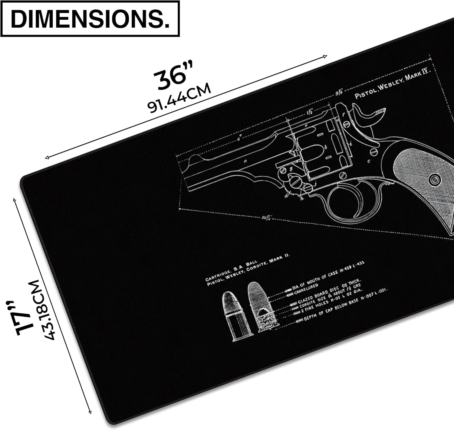 MPCO. Blueprints Large Gaming Desk Pad - 36" x 17" Duraglyde Fabric Pistol Webly Mark IV – Black Desk Mats - Non-Slip, Washable, Smooth Glide for Precision Gaming & Work