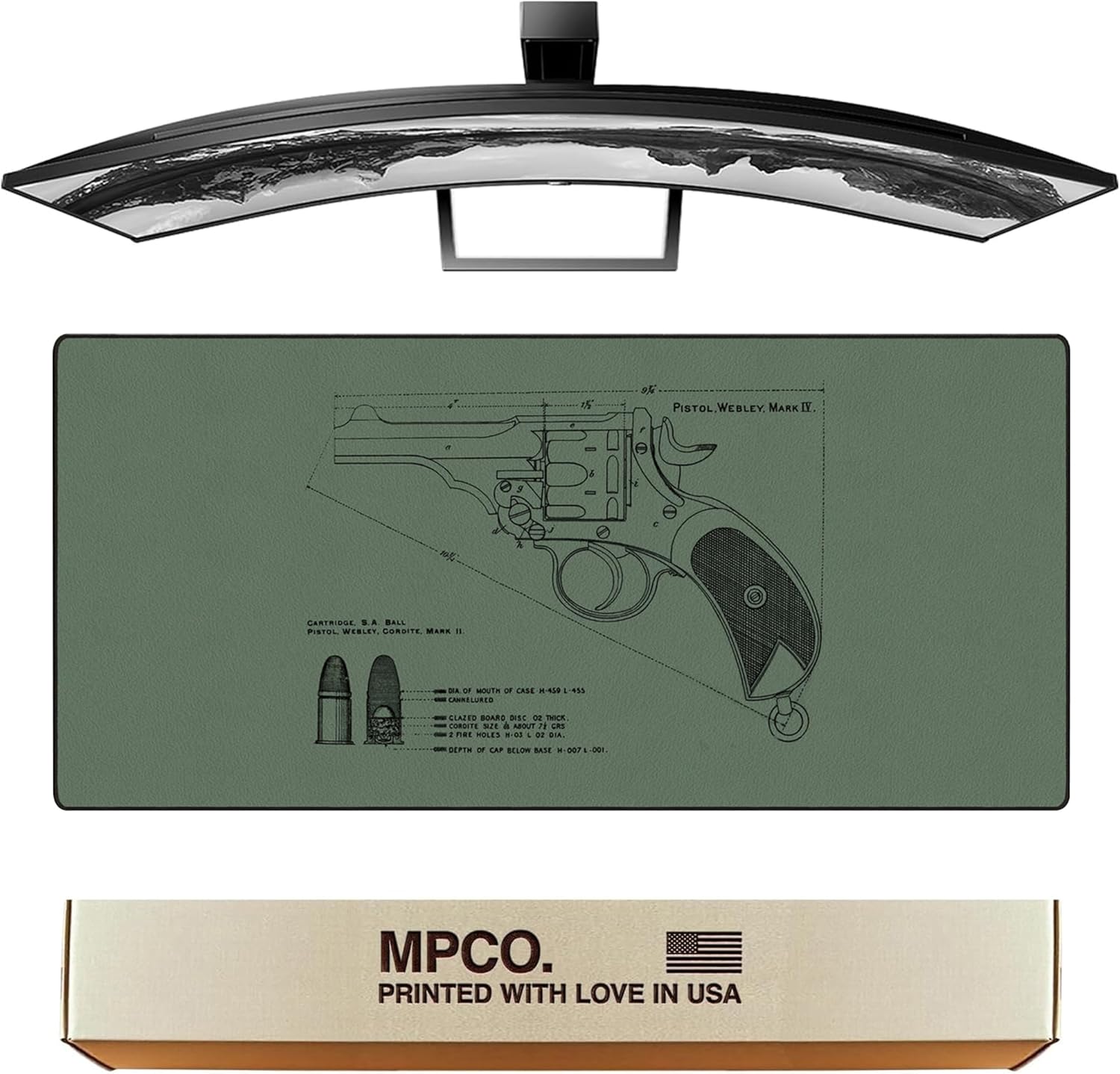 MPCO. Blueprints Large Gaming Desk Pad - 36" x 17" Duraglyde Fabric Pistol Webly Mark IV – Green Desk Mats - Non-Slip, Washable, Smooth Glide for Precision Gaming & Work