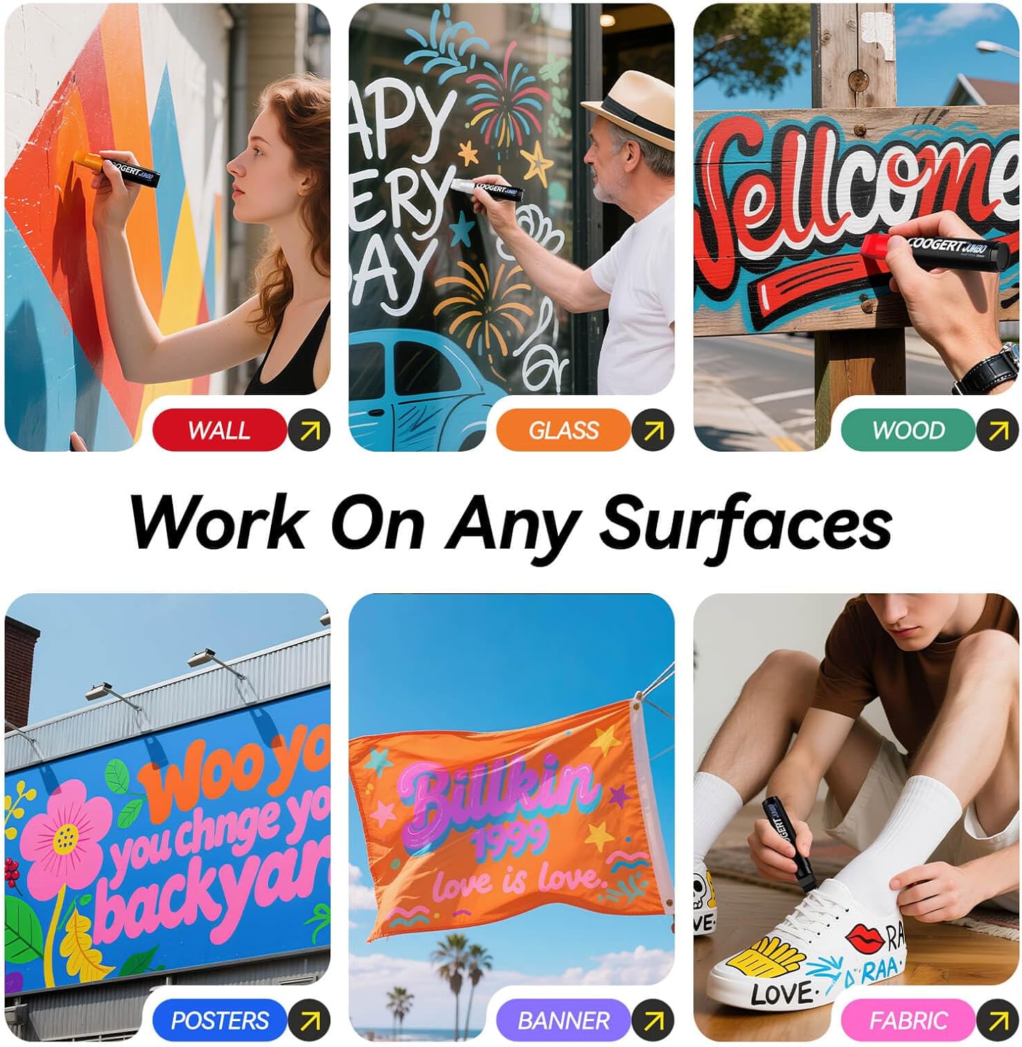 - MULTI-SURFACE – permanent jumbo paint markers are versatile enough to be used on a variety of surfaces, paint markers for canvas, posters, banner, sign, wall, fabric, wood, , rocks, glass, plastic, metal ,anchor charts, car, windows, cardboard and more