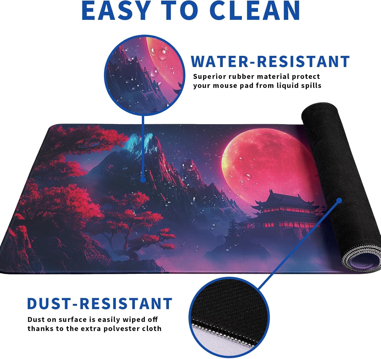 - ā„[Easy To Clean]:This large Darkness Red Moon mouse pad for desk, Spill-proof coating protects your desktop from spilled water, Drinks, Ink and the other liquid spilled liquid or other accidents. Easy to clean, Just wipe with a wet cloth or paper, Does not fade and can be washed and foldable without leaving creases, Easy to carry.