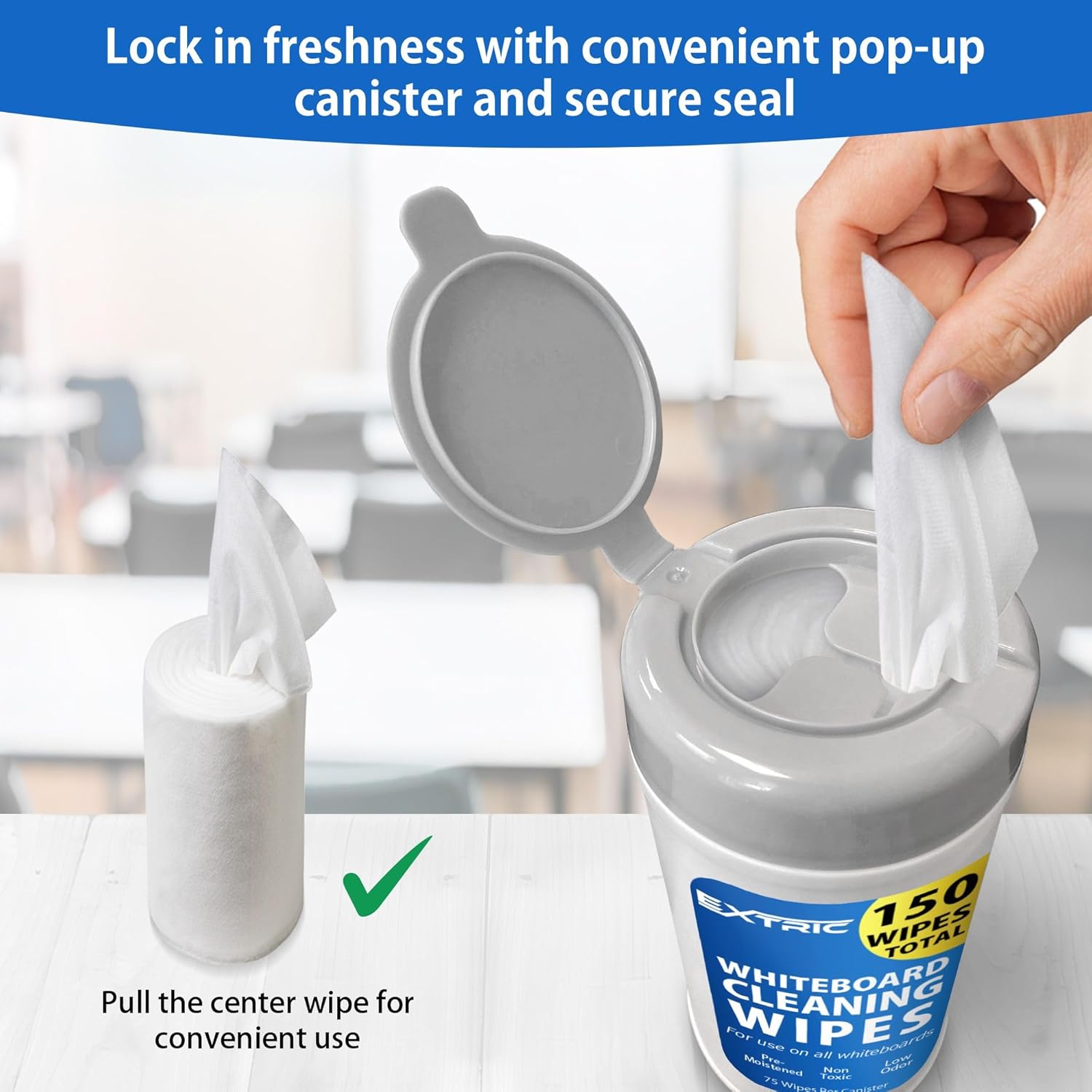 EXTRIC Whiteboard Cleaning Wipes, 150 Count Dry Erase Wipes Pre-Moistened, Non-Toxic, Low Odor White Board Cleaner 75 Per Canister + 75 Refill Pack Ideal for Classroom, School, Office