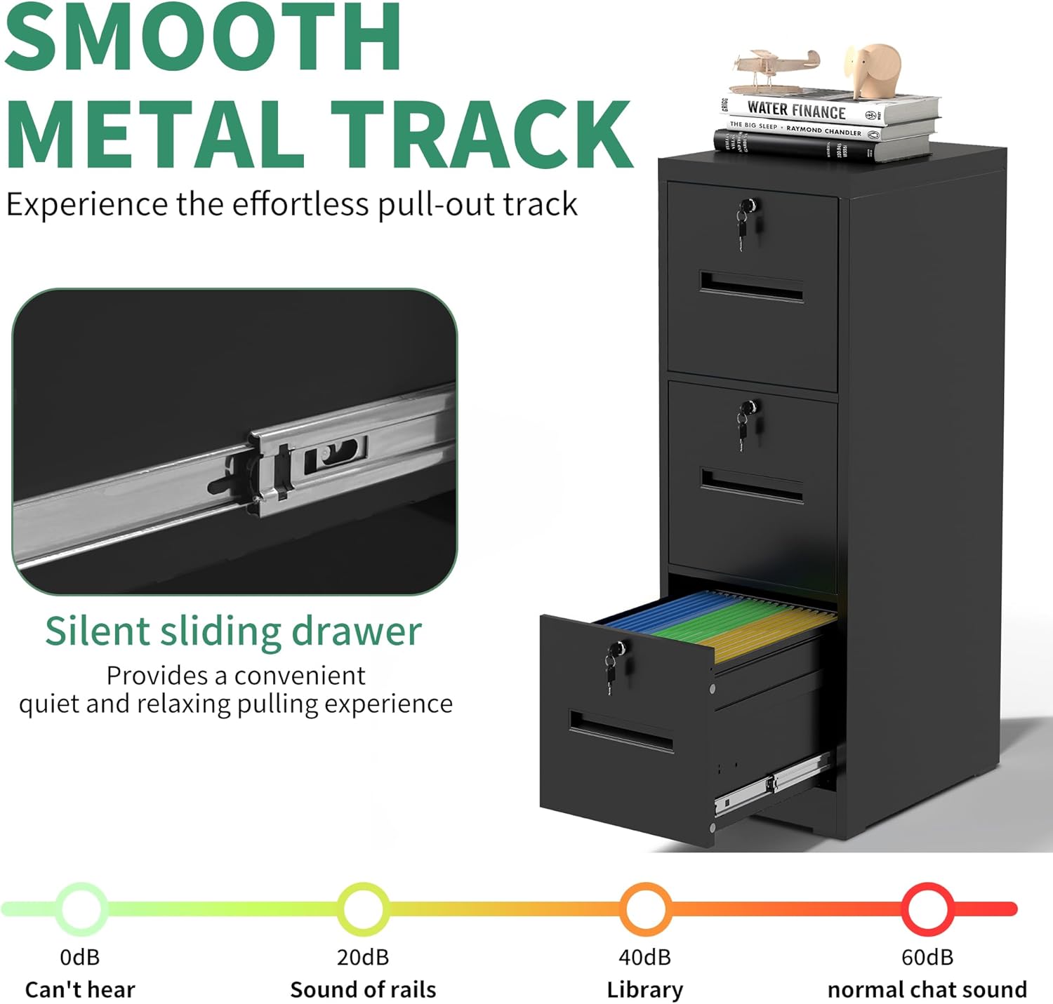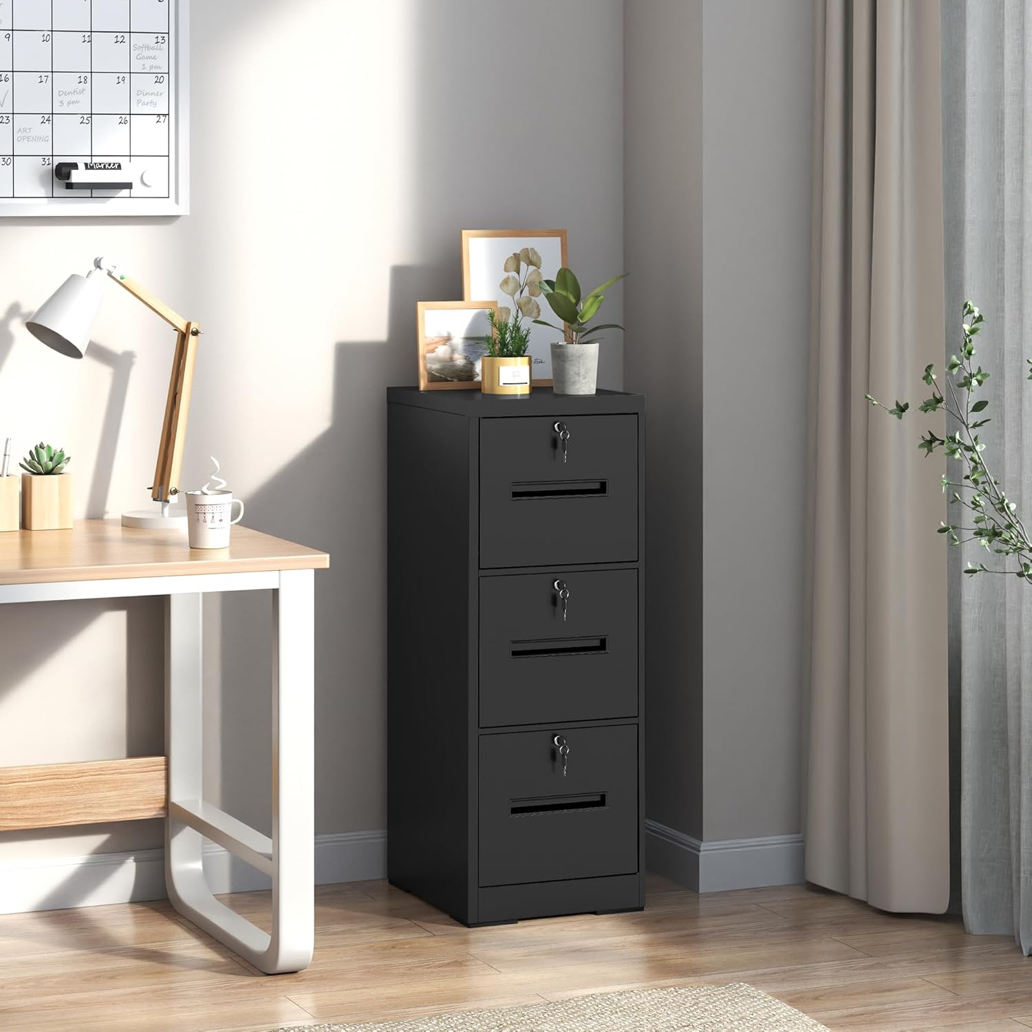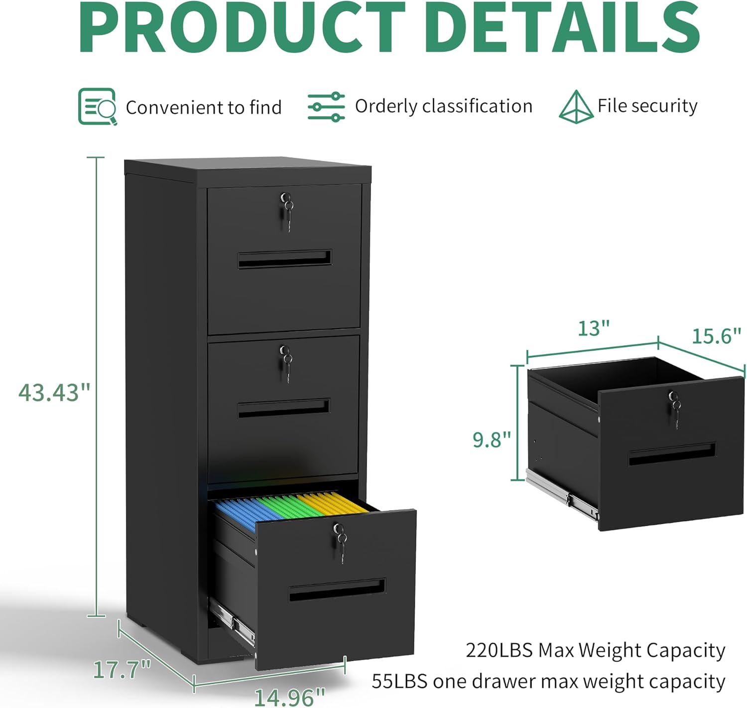 File Cabinet 3 Drawer with Lock, Vertical Filing Cabinets for Home Office, Metal Steel Storage Cabinet for Letter/Legal Size File, Assembly Required(Black)