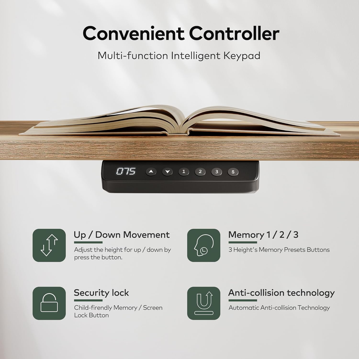 - Memory Height & Anti-Collison Technology: Standing desk has 2 programmable memory height buttons. If the adjustable desk encounters obstacles when lifting, it will move 2cm in the opposite direction to avoid possible damage or injury.