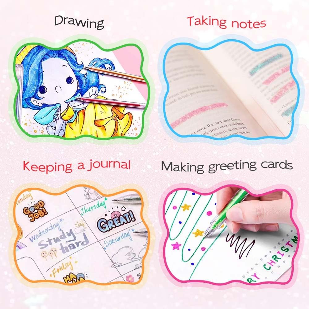 - 【Thoughtful, Easy-to-Use Design】:These Shimmer Gel Pens feature a lightweight barrel and secure pen cap, making them suitable for both kids and adults. Dual tone gel pens are easy to handle and store, with colored barrels for quick color identification during crafting or journaling.